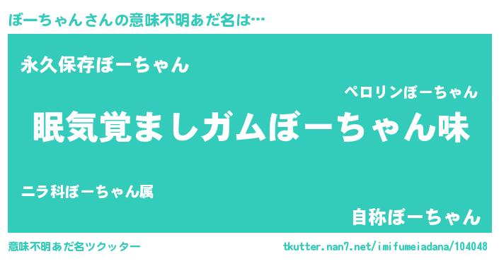 | 男性向けラノベタイトル風あだ名 | 『うちのぼーちゃんが世界を掌握している!』 |