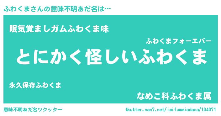 | 男性向けラノベタイトル風あだ名 | 『ふわくまの嫁は女の子じゃないと思った?』 |