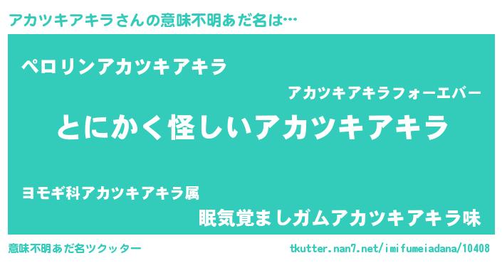| 女子向けラノベタイトル風あだ名 | 『アカツキアキラの卵を拾いまして』 |