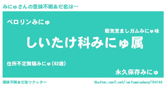 | 男性向けラノベタイトル風あだ名 | 『ミニュスレイヤー』『みにゅの憂鬱』 |