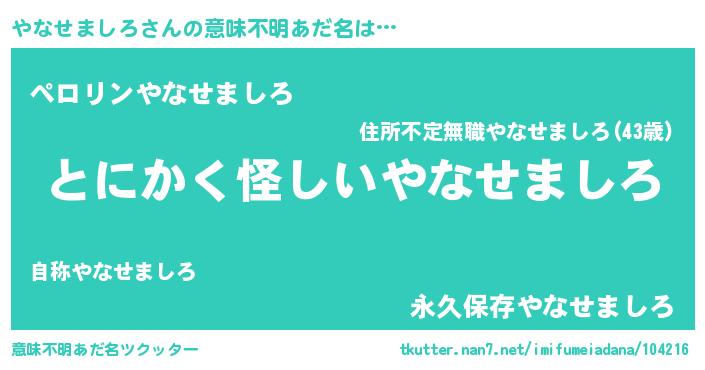 | 男性向けラノベタイトル風あだ名 | 『やなせましろの嫁は女の子じゃないと思った?』 |
