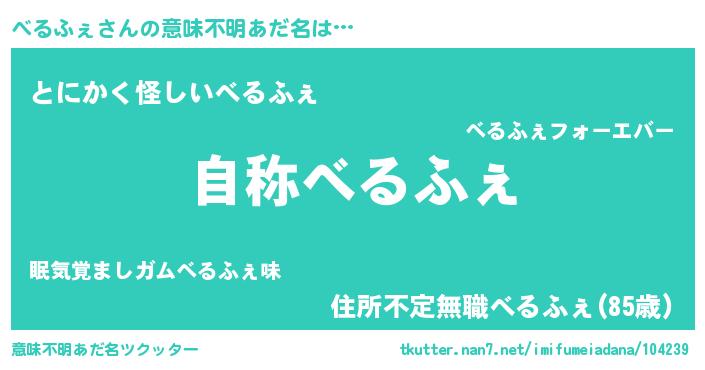 | 女子向けラノベタイトル風あだ名 | 『闇のべるふぇ』『べるふぇは平凡を望む』 |