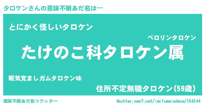| 男性向けラノベタイトル風あだ名 | 『転生したらタロケンだった件』 |