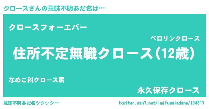 | 男性向けラノベタイトル風あだ名 | 『この素晴らしい世界にクロースを!』 |