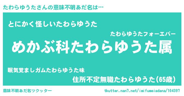 | 男性向けラノベタイトル風あだ名 | 『タワラユウタスレイヤー』 |