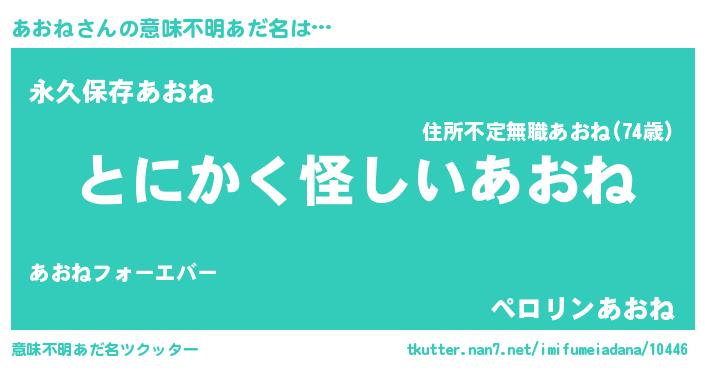 | 男性向けラノベタイトル風あだ名 | 『あおねの嫁は女の子じゃないと思った?』 |