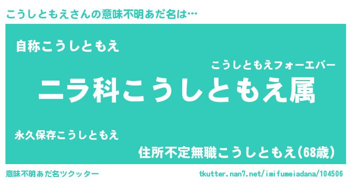 | 男性向けラノベタイトル風あだ名 | 『こうしともえ~年齢イコール彼女いない歴の魔法使い~』 |