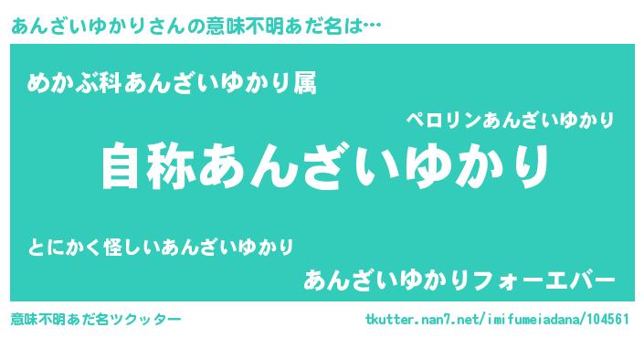 | 男性向けラノベタイトル風あだ名 | 『Re:あんざいゆかりから始める異世界生活』 |