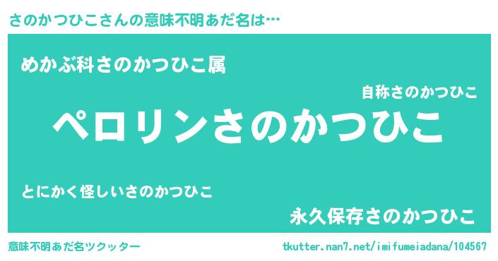 | 女子向けラノベタイトル風あだ名 | 『誰かこのさのかつひこを説明してください! ~契約から始まるウェディング~』 |
