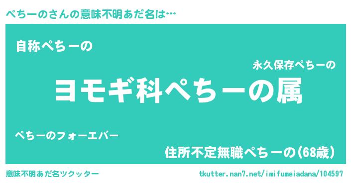 | 男性向けラノベタイトル風あだ名 | 『ぺちーの~年齢イコール彼女いない歴の魔法使い~』 |