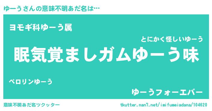 | ヒーロー風カッコイイあだ名 | 『慈愛の使者ゆーう』『炎刃騎士ユー』 |