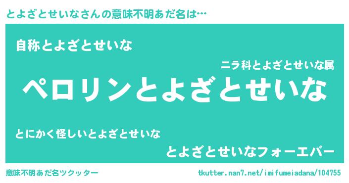 | 欧米人風あだ名 | 『とよざとせいな・ステッグマイヤー』 |