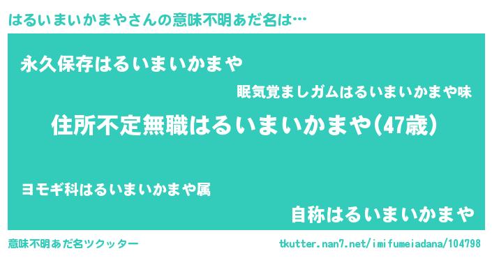 | 男性向けラノベタイトル風あだ名 | 『はるいまいかまやに滅ぼされるだけの簡単なお仕事です』 |