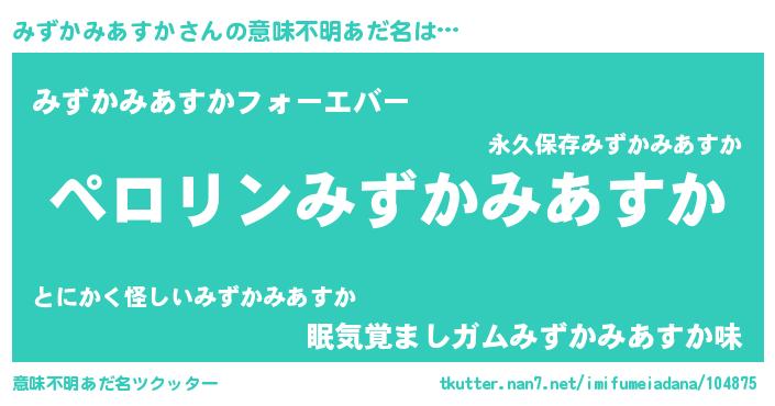 | 胡散臭い通販商品みたいなあだ名 | 『必ず成功するブレスレット…その名も「みずかみあすか」』 |