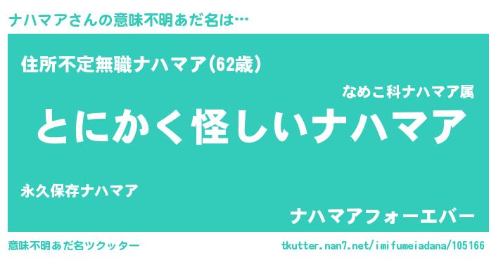 | 男性向けラノベタイトル風あだ名 | 『ダンジョンにナハマアを求めるのは間違っているだろうか』 |