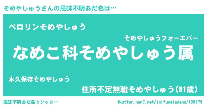 | 男性向けラノベタイトル風あだ名 | 『転生したらそめやしゅうだった件』 |
