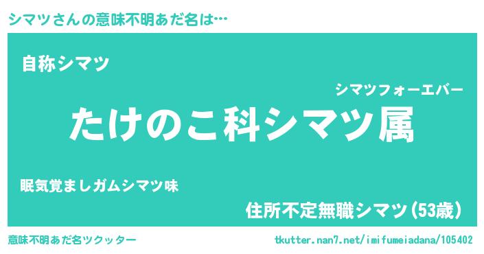 | 男性向けラノベタイトル風あだ名 | 『転生したらシマツだった件』 |