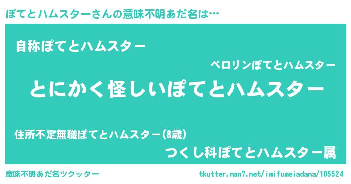 | 男性向けラノベタイトル風あだ名 | 『ぽてとハムスターの嫁は女の子じゃないと思った?』 |