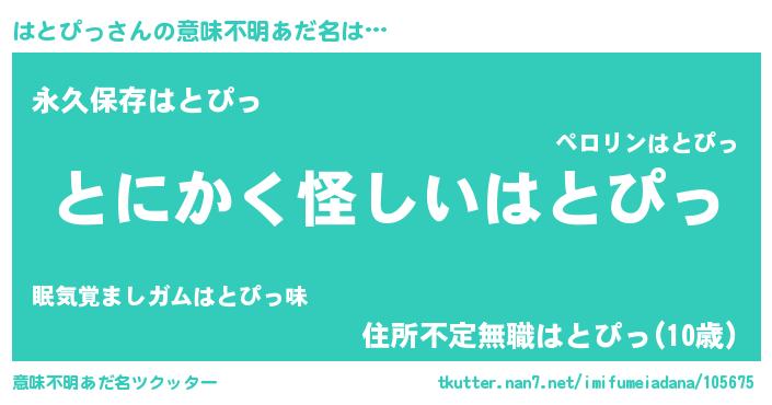 | 胡散臭い通販商品みたいなあだ名 | 『信頼と実績のサプリメント…その名も「はとぴっ」』 |