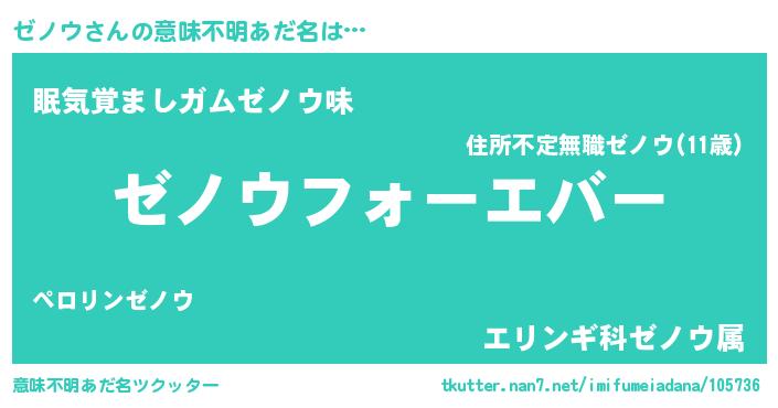 | 女子向けラノベタイトル風あだ名 | 『ゼノウの雑貨屋さん』『ゼノウ恋絵巻』 |