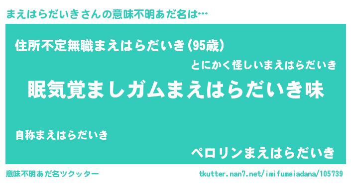 | 男性向けラノベタイトル風あだ名 | 『おまえをオタクにしてやるから、俺をまえはらだいきにしてくれ! 』 |