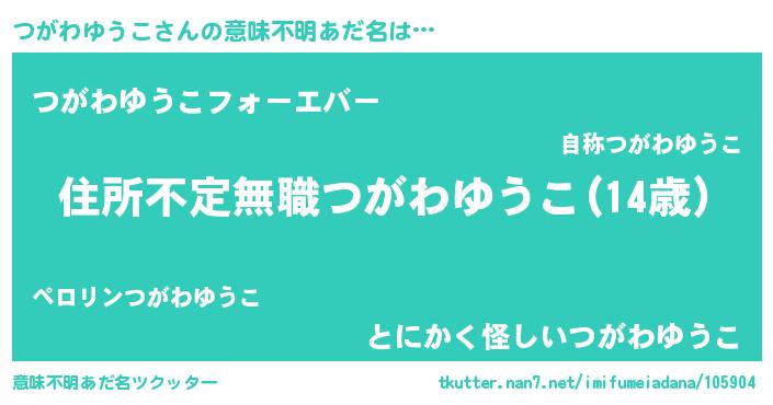 | 女子向けラノベタイトル風あだ名 | 『つがわゆうこが死なない童話 林檎のつがわゆうこの診療簿』 |