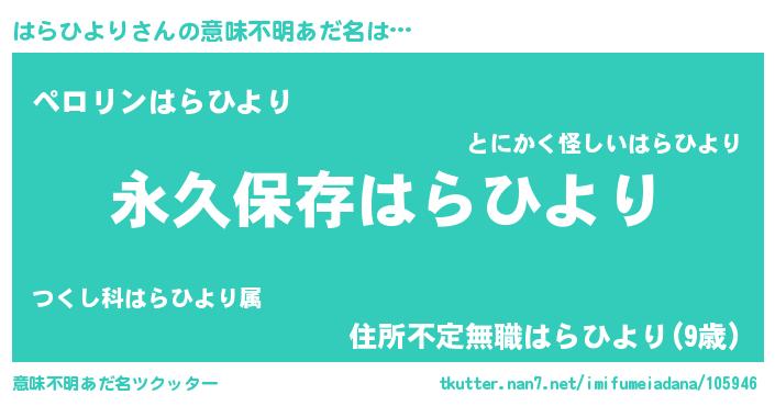| 男性向けラノベタイトル風あだ名 | 『はらひよりという概念が存在しない退屈な世界 』 |