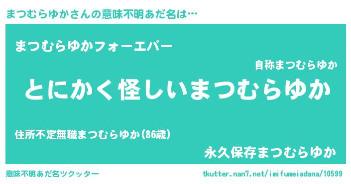 | 男性向けラノベタイトル風あだ名 | 『まつむらゆかの嫁は女の子じゃないと思った?』 |