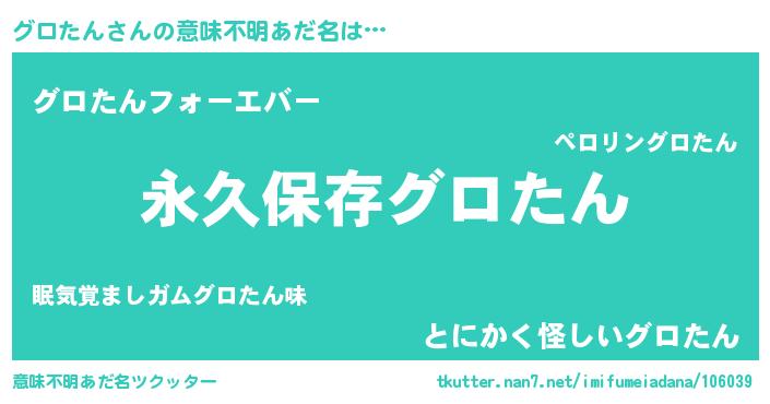 | 女子向けラノベタイトル風あだ名 | 『異世界で失敗しない100のグロたん』 |