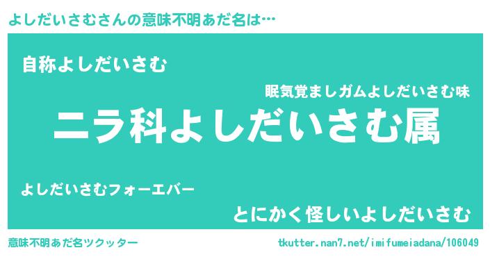 | 男性向けラノベタイトル風あだ名 | 『よしだいさむ~年齢イコール彼女いない歴の魔法使い~』 |