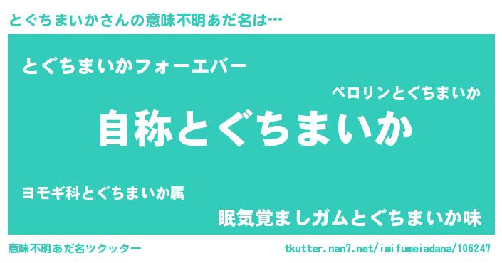 | 男性向けラノベタイトル風あだ名 | 『うちのとぐちまいかが世界を掌握している!』 |