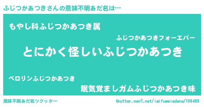 | 男性向けラノベタイトル風あだ名 | 『ふじつかあつきの嫁は女の子じゃないと思った?』 |