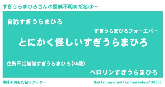 | 胡散臭い通販商品みたいなあだ名 | 『信頼と実績のサプリメント…その名も「すぎうらまひろ」』 |