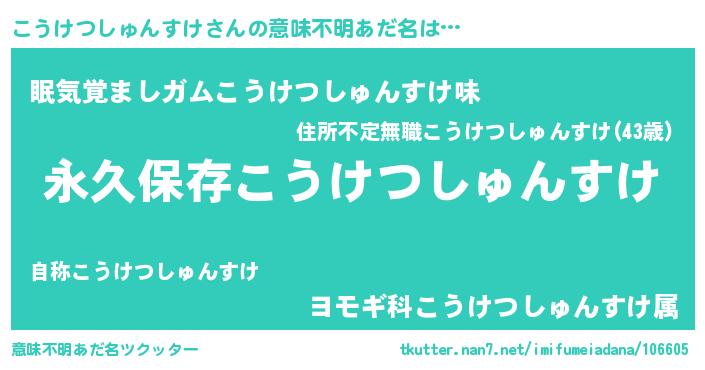 | 男性向けラノベタイトル風あだ名 | 『こうけつしゅんすけに滅ぼされるだけの簡単なお仕事です』 |