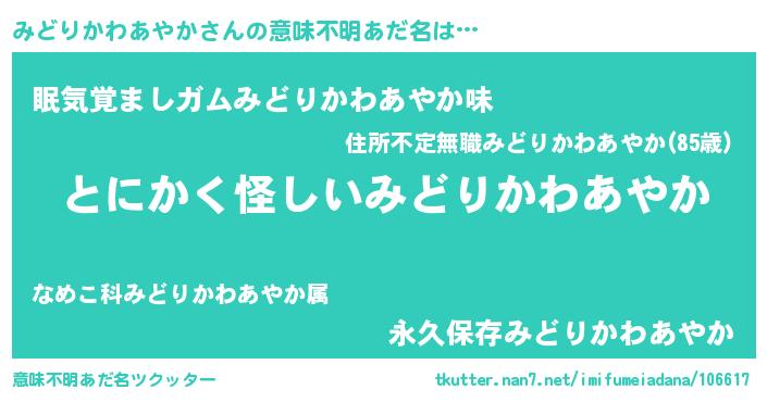 | 女子向けラノベタイトル風あだ名 | 『みどりかわあやかの卵を拾いまして』 |
