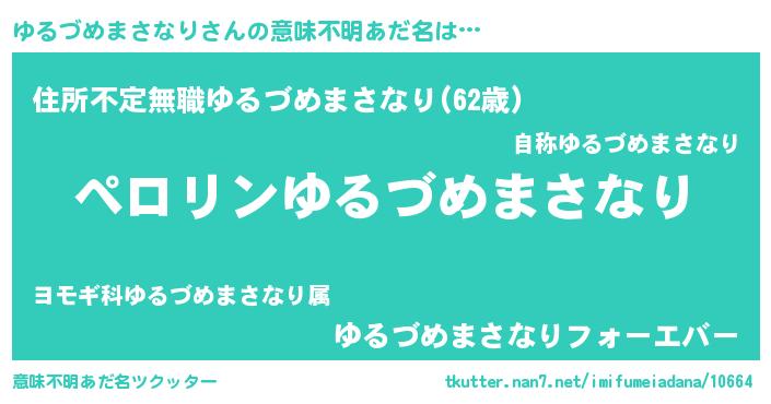 | 男性向けラノベタイトル風あだ名 | 『はたらくゆるづめまさなりさま!』 |