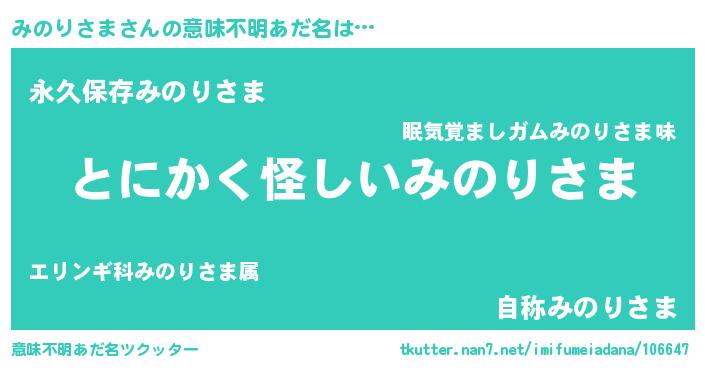 | 男性向けラノベタイトル風あだ名 | 『みのりさまの嫁は女の子じゃないと思った?』 |