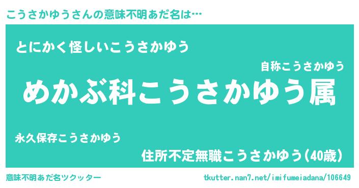 | 胡散臭い通販商品みたいなあだ名 | 『信頼と実績のサプリメント…その名も「こうさかゆう」』 |