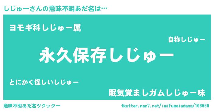 | 男性向けラノベタイトル風あだ名 | 『しじゅーという概念が存在しない退屈な世界 』 |