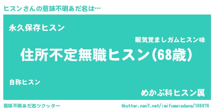 | 男性向けラノベタイトル風あだ名 | 『この素晴らしい世界にヒスンを!』 |