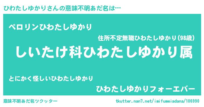 | 男性向けラノベタイトル風あだ名 | 『ヒワタシユカリスレイヤー』 |