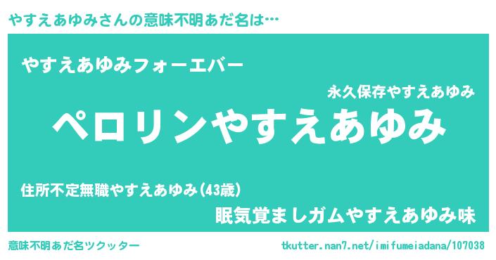 | 男性向けラノベタイトル風あだ名 | 『やすえあゆみの憂鬱』 |
