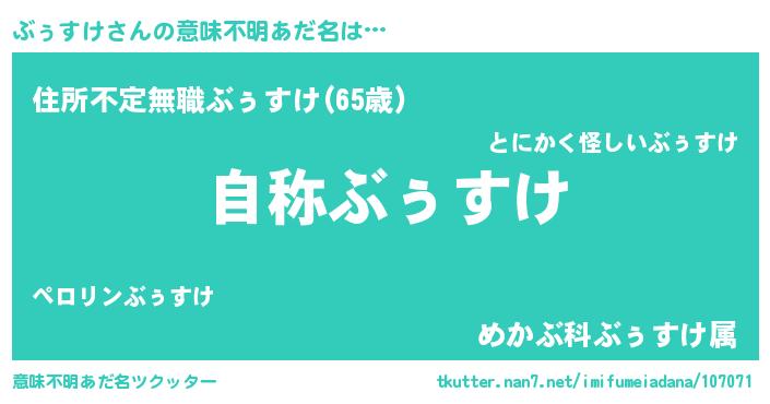 | 女子向けラノベタイトル風あだ名 | 『闇のぶぅすけ』『ぶぅすけは平凡を望む』 |