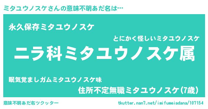 | 男性向けラノベタイトル風あだ名 | 『ミタユウノスケ~年齢イコール彼女いない歴の魔法使い~』 |