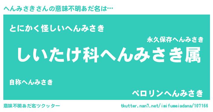 | 胡散臭い通販商品みたいなあだ名 | 『信頼と実績のサプリメント…その名も「へんみさき」』 |
