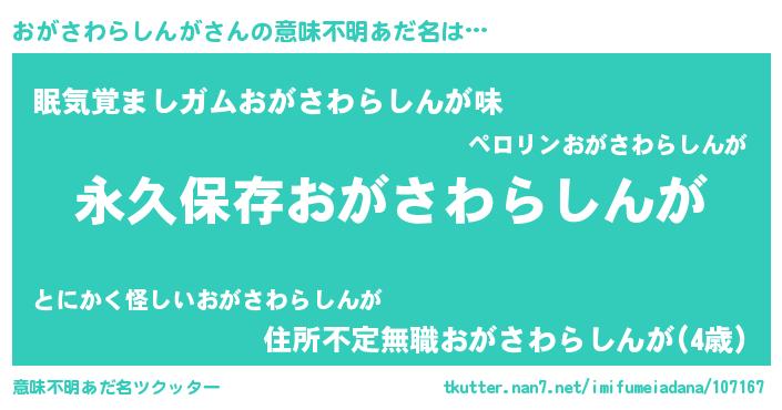 | 男性向けラノベタイトル風あだ名 | 『おがさわらしんがという概念が存在しない退屈な世界 』 |
