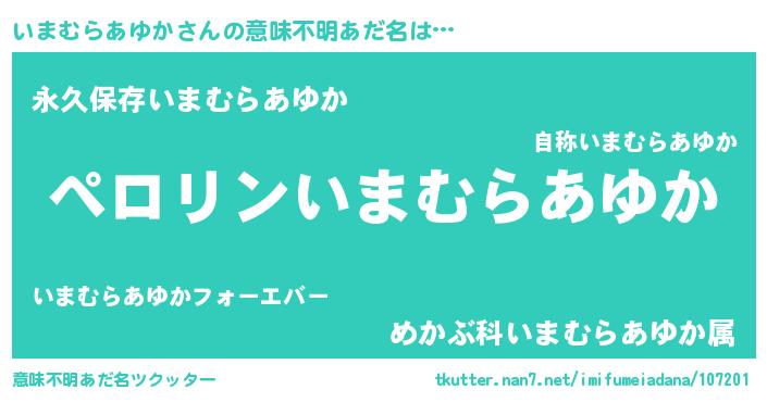 | ヘコむあだ名 | 『いまもー』『いまむらあゆか(震え声)』 |