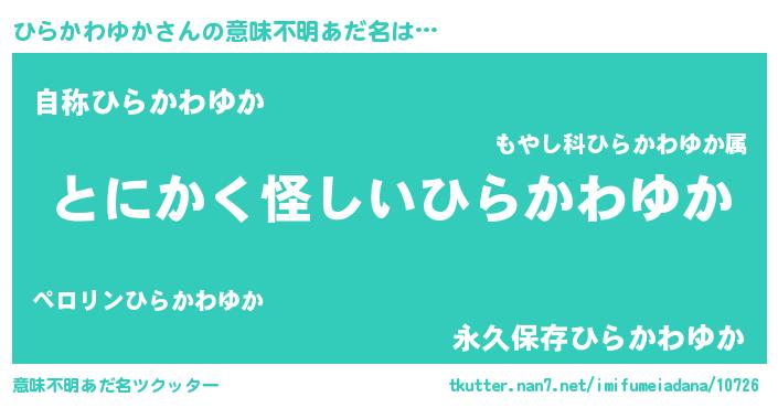 | 男性向けラノベタイトル風あだ名 | 『ひらかわゆかの嫁は女の子じゃないと思った?』 |