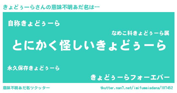 | 男性向けラノベタイトル風あだ名 | 『きょどぅーらの嫁は女の子じゃないと思った?』 |