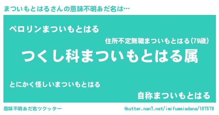 | 男性向けラノベタイトル風あだ名 | 『まついもとはる~年齢イコール彼女いない歴の魔法使い~』 |